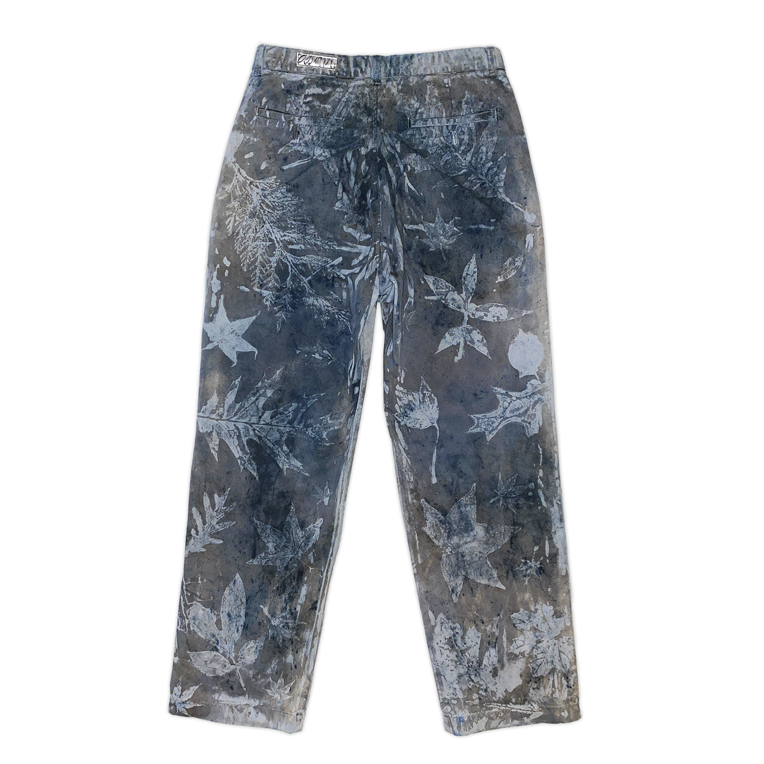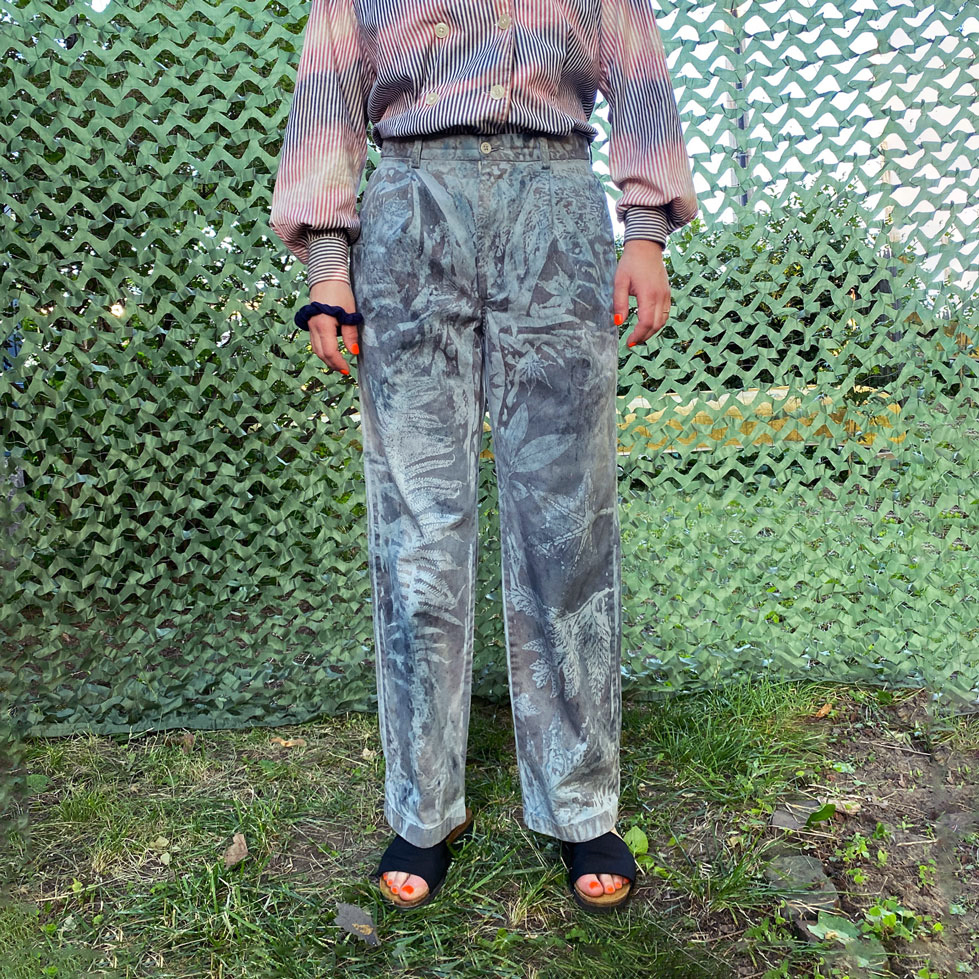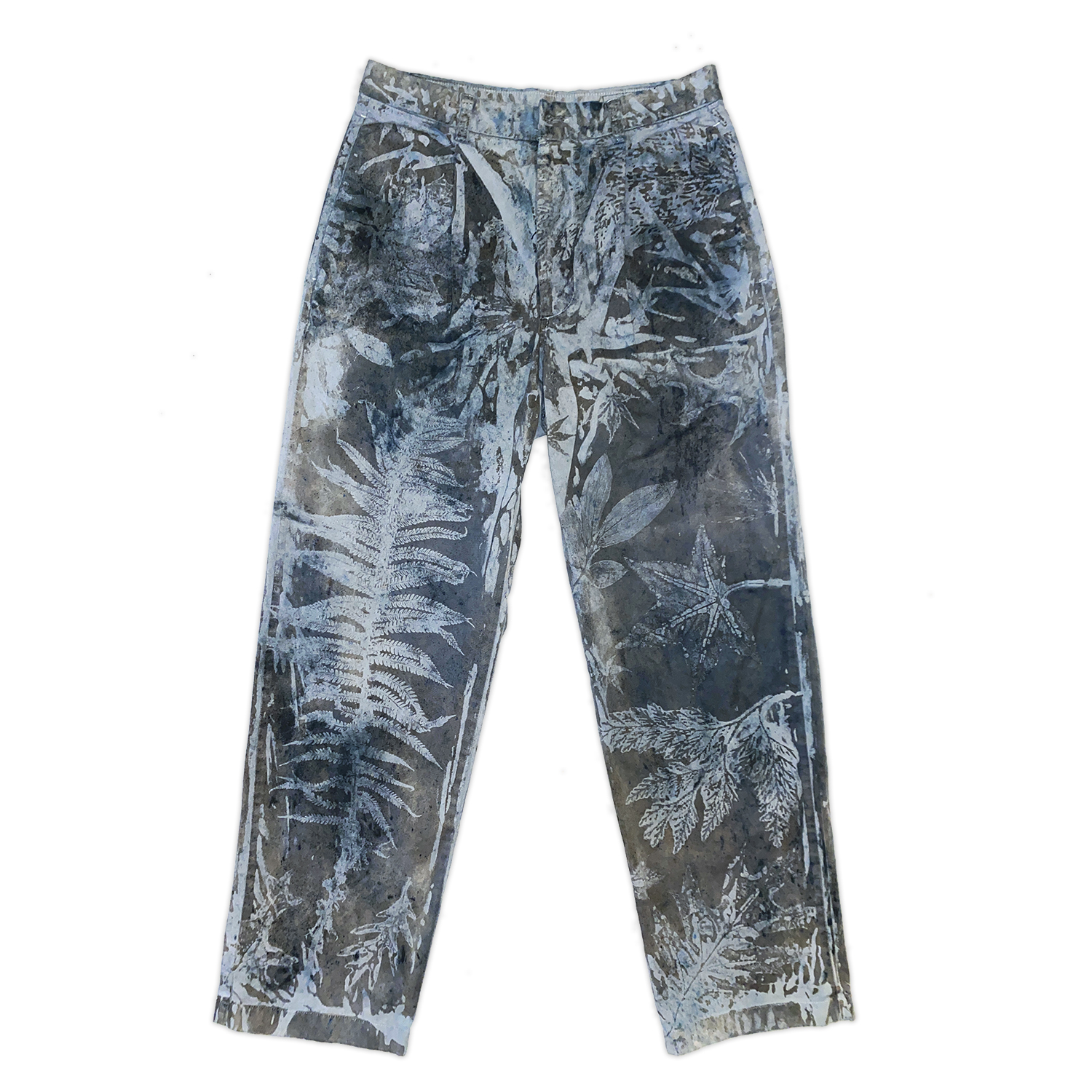 1-of-1 hand-printed hand-dyed chinos upcycled vintage 100% cotton printed with ferns and leaves sustainably harvested in Providence, RI & Philadelphia, PA