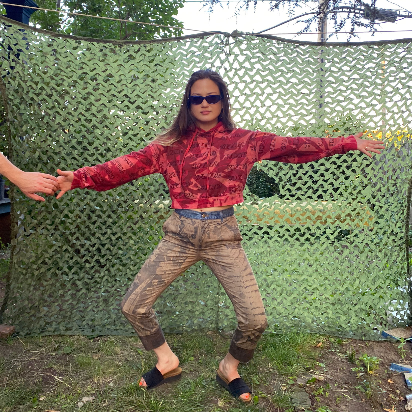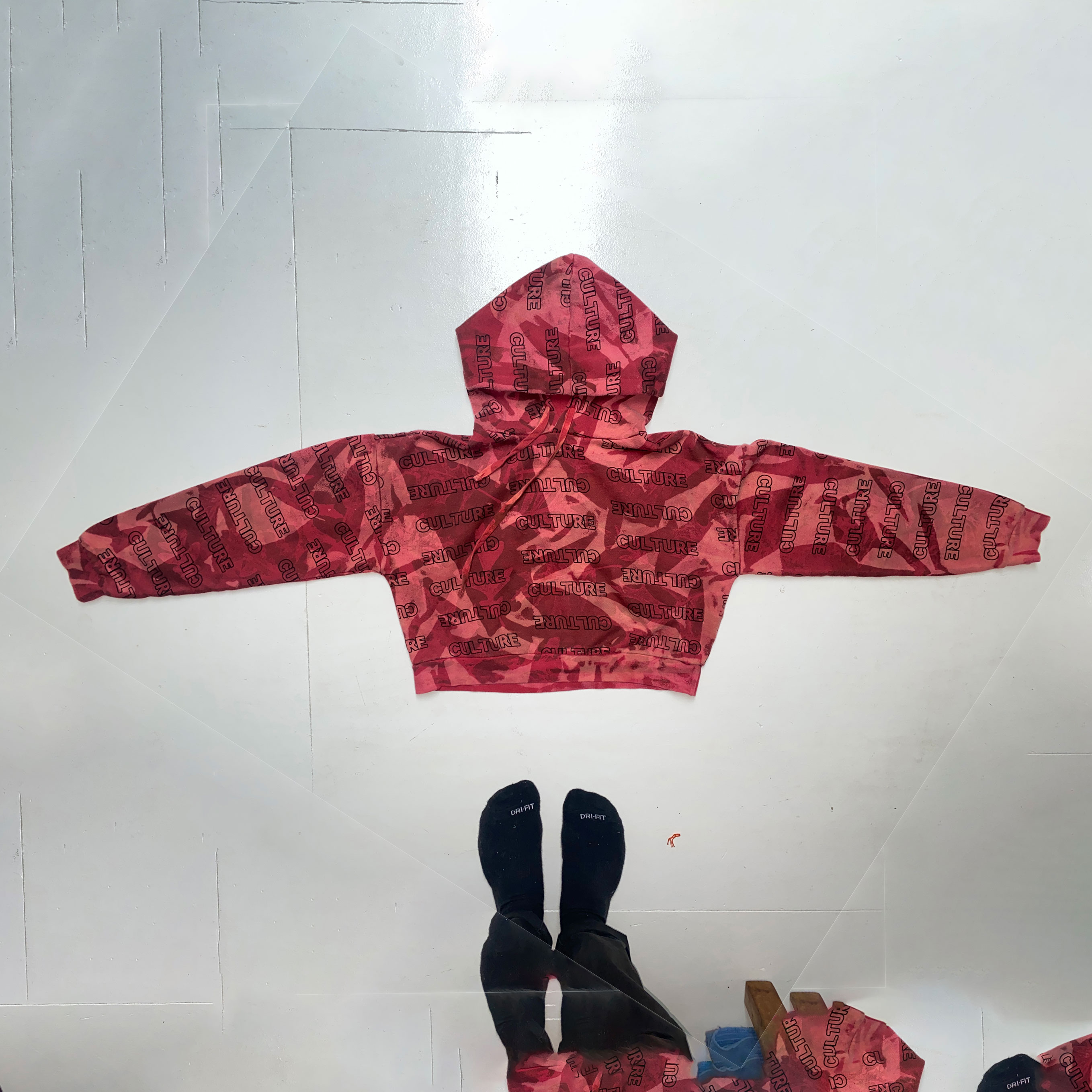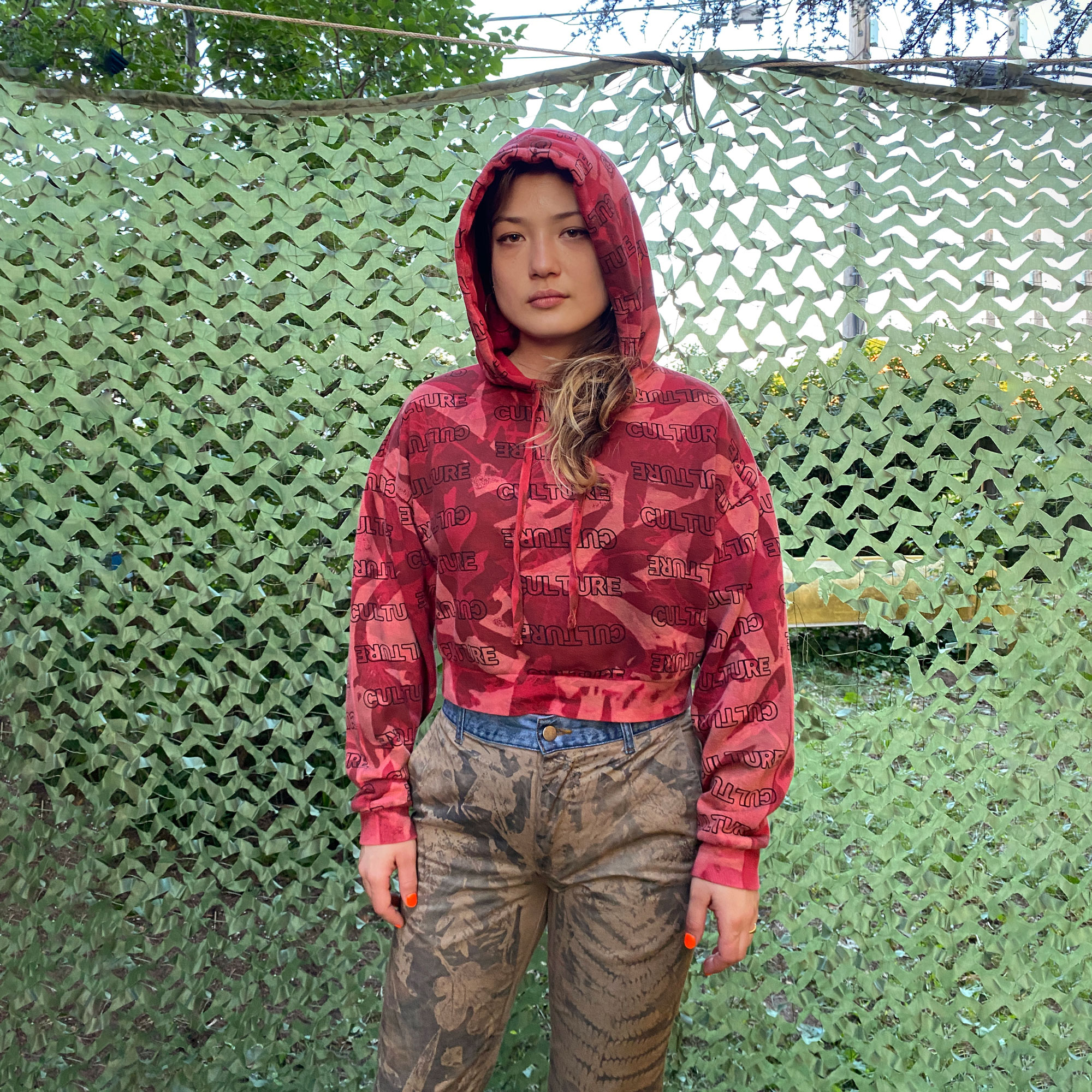 1-of-1 cropped hoodie hand dyed and bleached in Providence, RI using sustainably sourced local foliage on a vintage garment