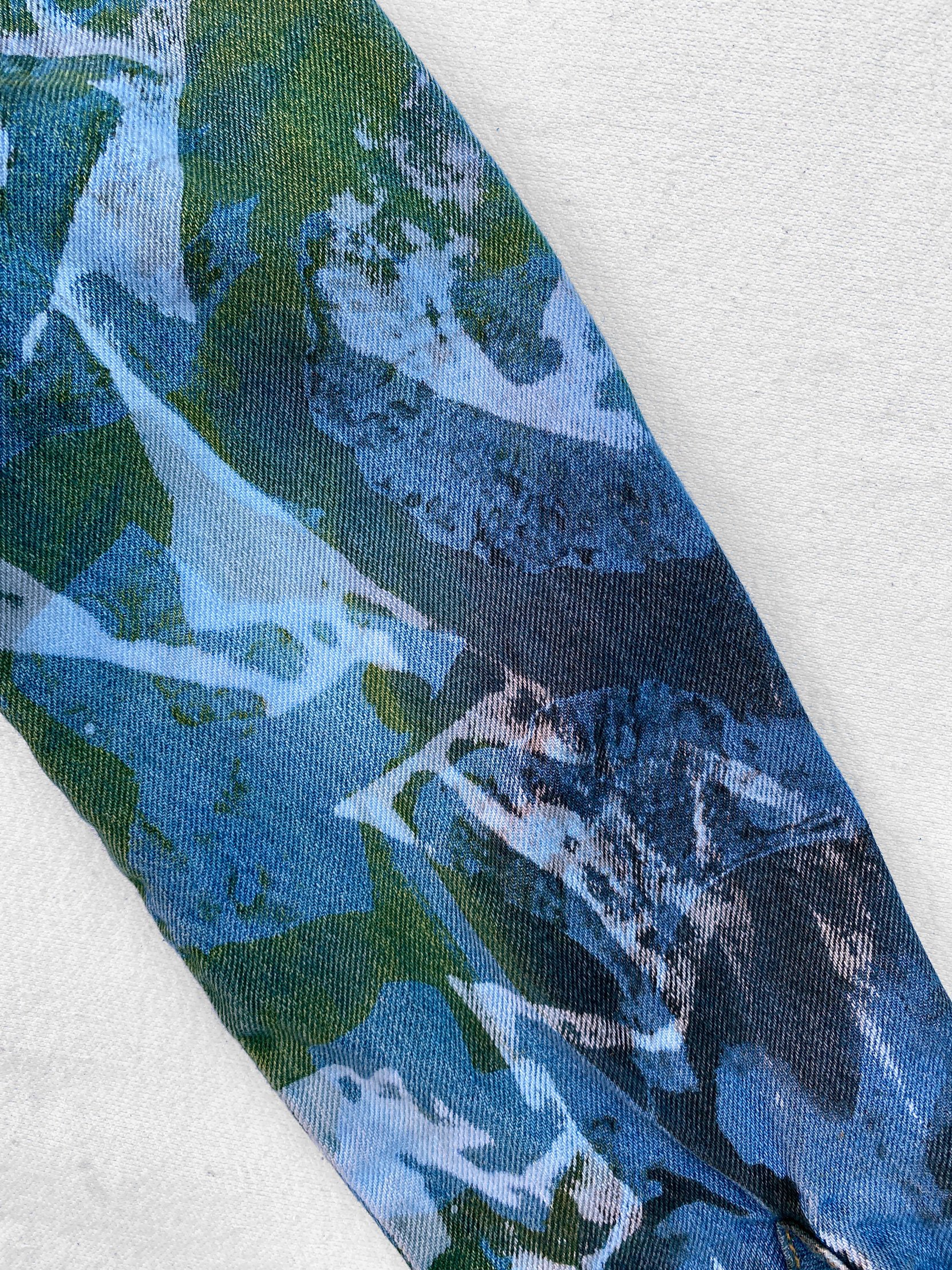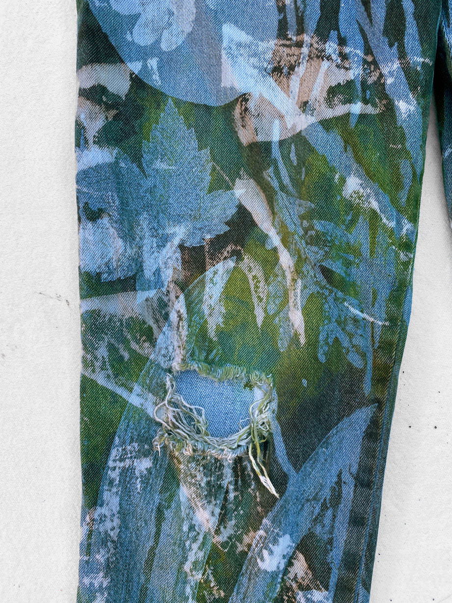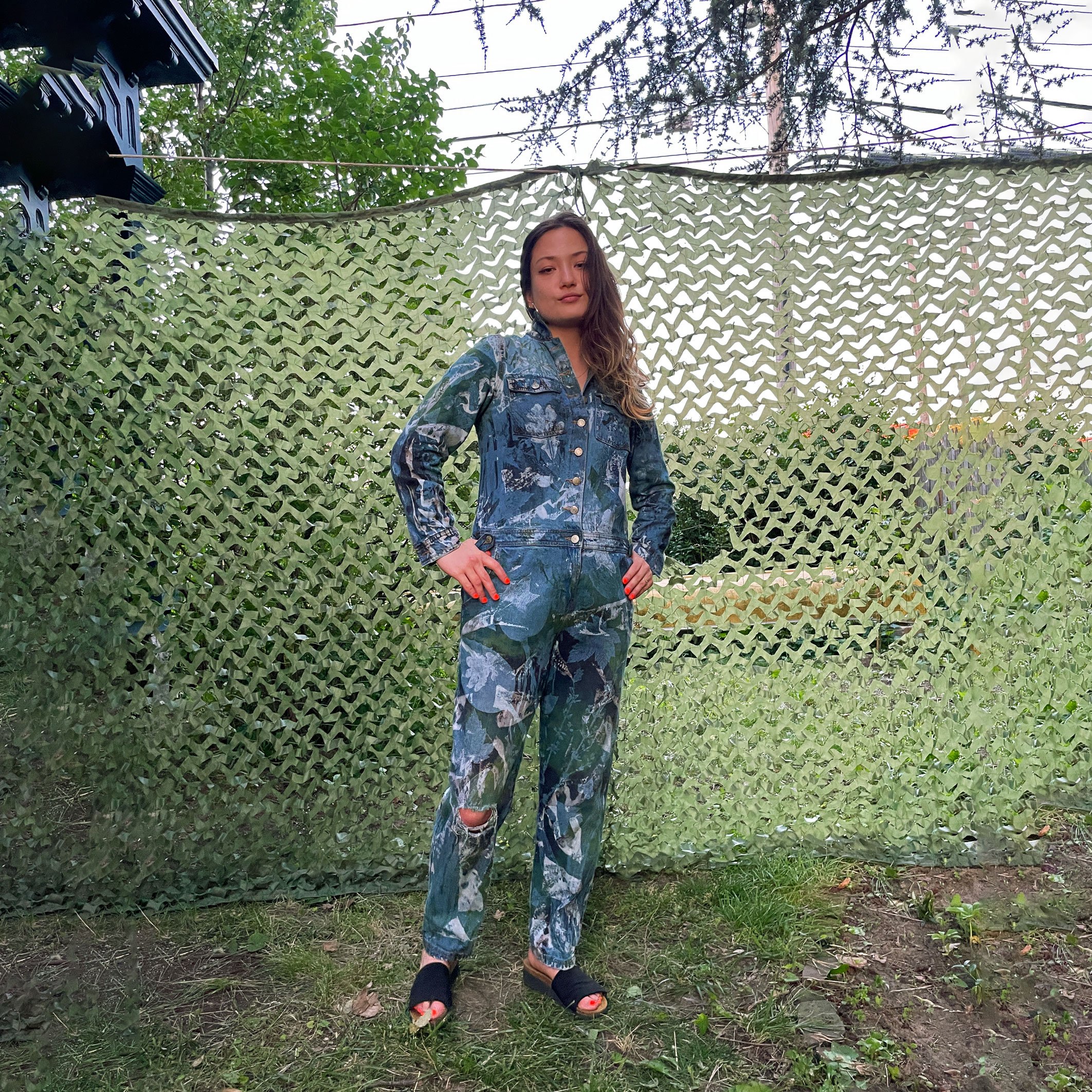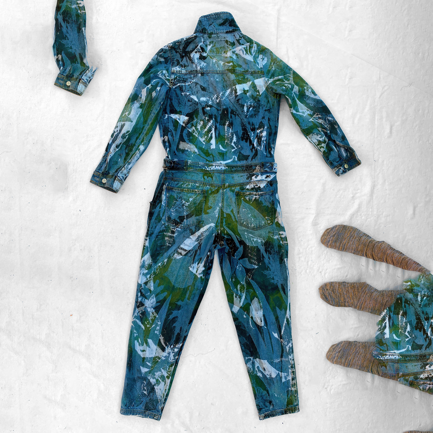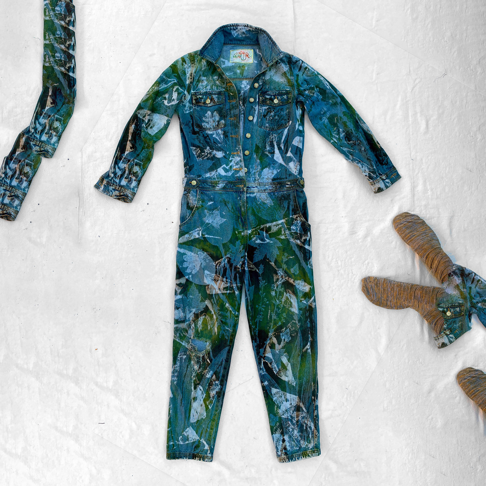 1-of-1 denim jumpsuit hand dyed and bleached in Providence, RI using sustainably sourced local foliage on a vintage garment