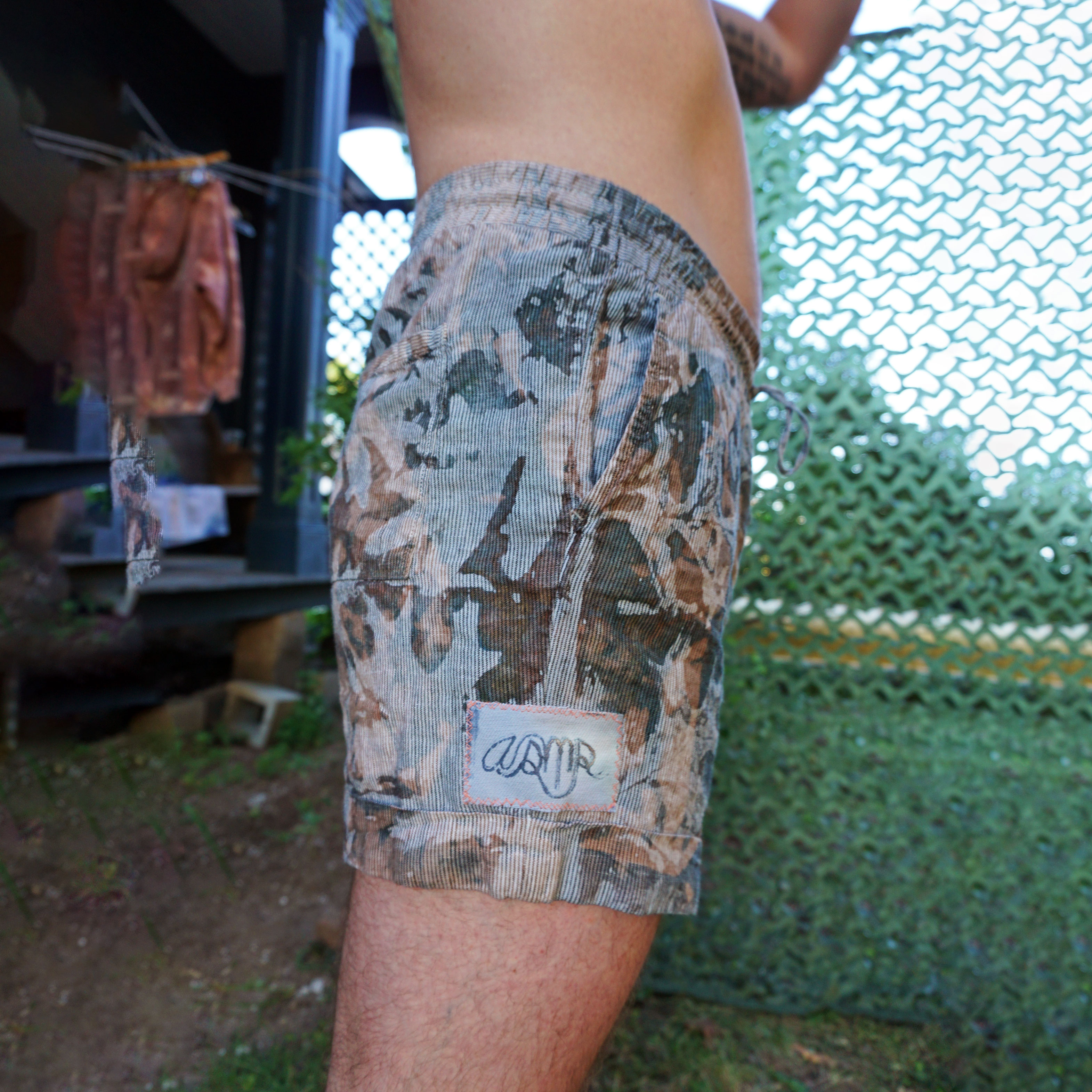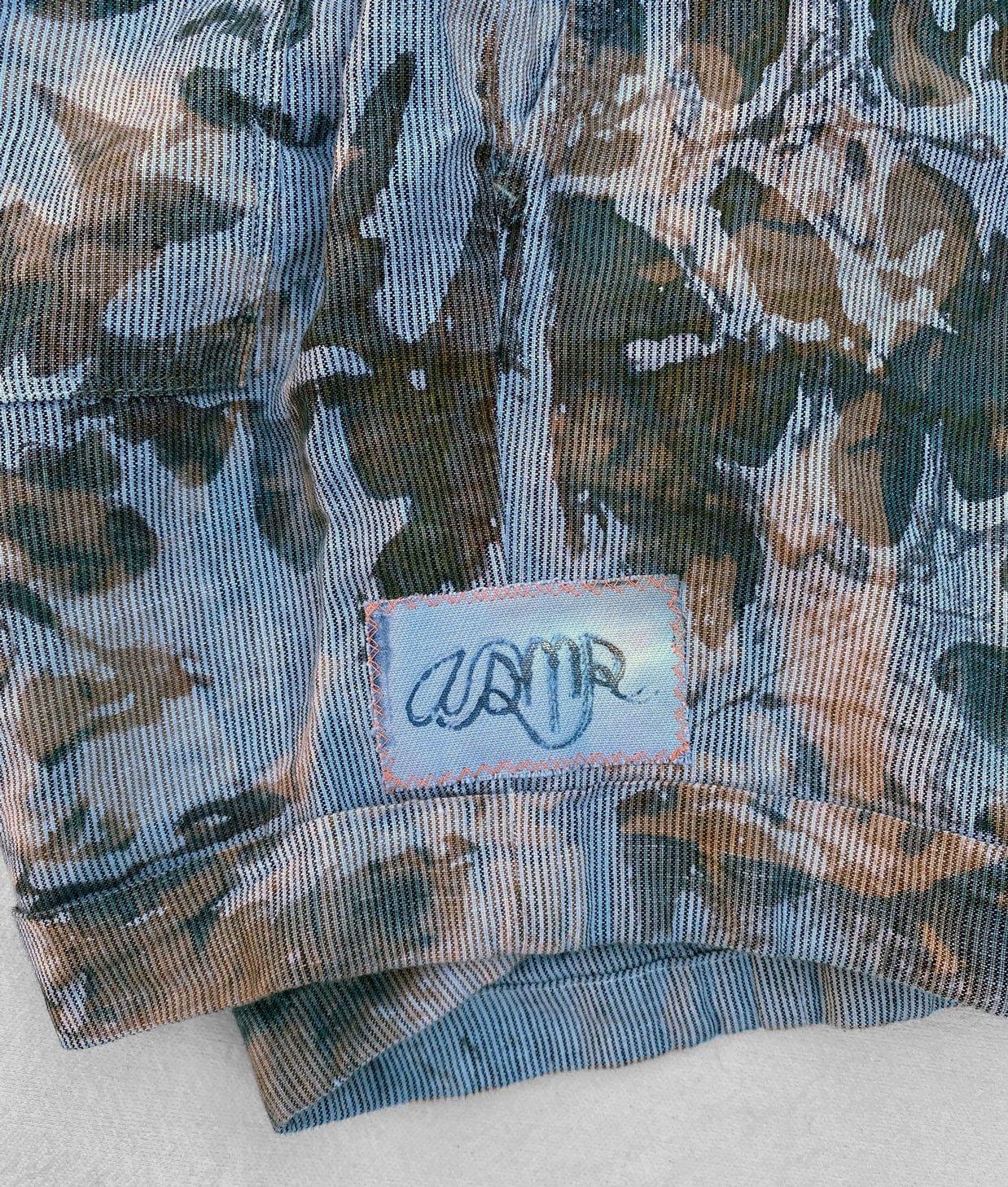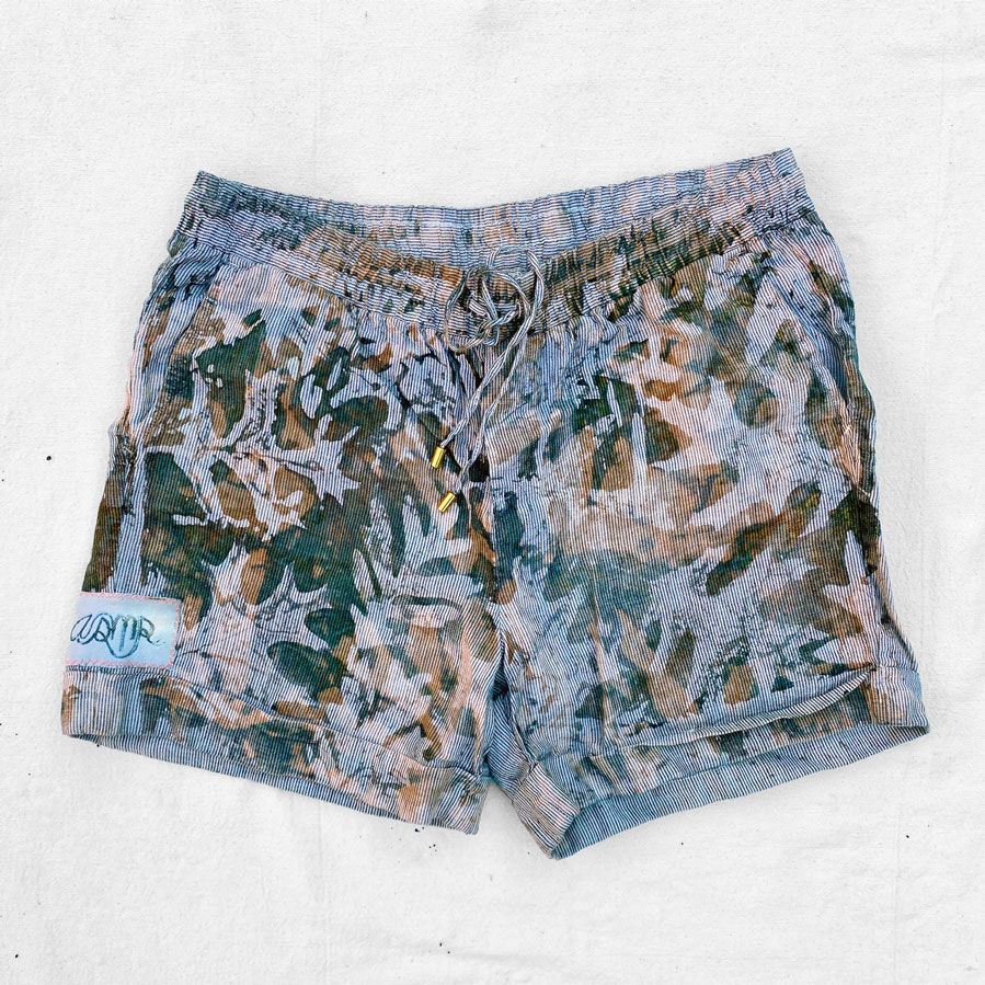 1-of-1 drawstring shorts hand dyed and bleached in Providence, RI using sustainably sourced local foliage on a vintage garment